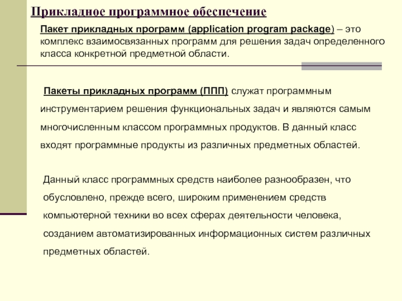 Пакет прикладных программ (application program package) – это комплекс взаимосвязанных программ для решения задач определенного класса конкретной предметной области.