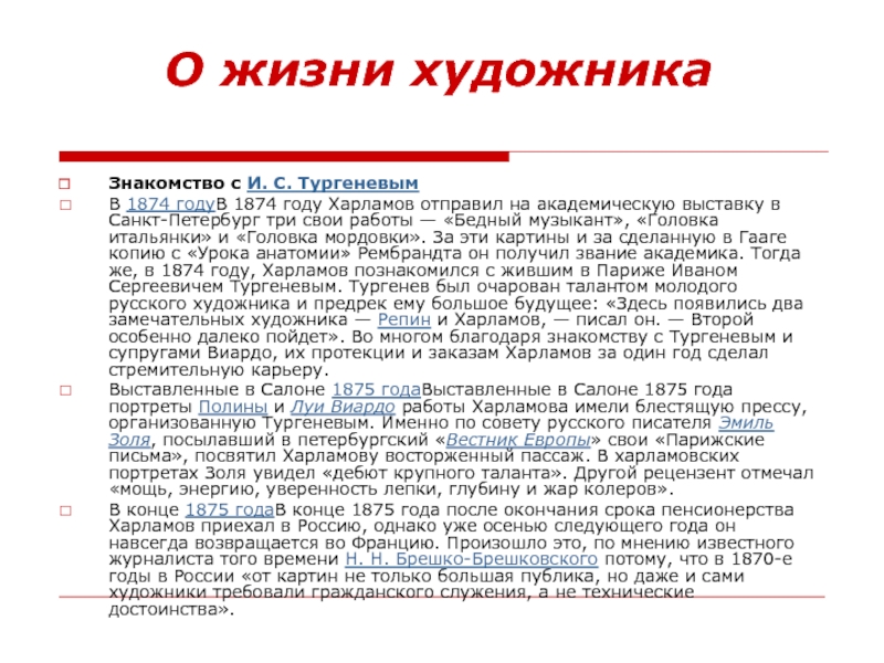 Выставленные в Салоне 1875 годаВыставленные в Салоне 1875 года портреты Полины и Луи Виардо работы Харламова имели блестящую прессу, организованную Тургеневым. Именно по совету русского писателя Эмиль Золя, посылавший в петербургский «Вестник Европы» свои «Парижские письма», посвятил Харламову восторженный пассаж. В харламовских портретах Золя увидел «дебют крупного таланта». Другой рецензент отмечал «мощь, энергию, уверенность лепки, глубину и жар колеров».