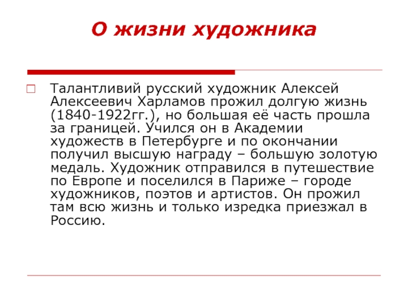 (1840-1922гг.), но большая её часть прошла за границей. Учился он в Академии художеств в Петербурге и по окончании получил высшую награду – большую золотую медаль. Художник отправился в путешествие по Европе и поселился в Париже – городе художников, поэтов и артистов. Он прожил там всю жизнь и только изредка приезжал в Россию.