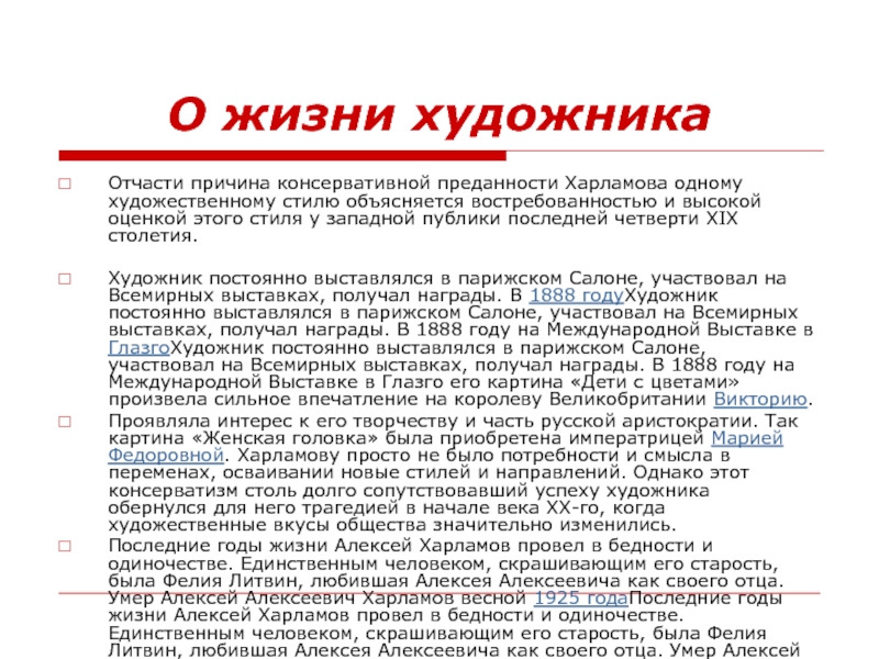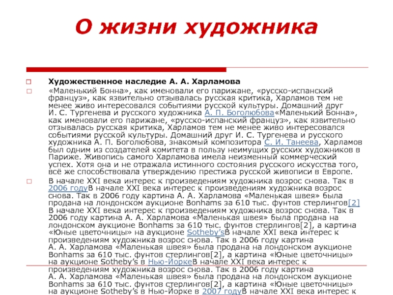 француз», как язвительно отзывалась русская критика, Харламов тем не менее живо интересовался событиями русской культуры. Домашний друг И. С. Тургенева и русского художника А. П. Боголюбова«Маленький Бонна», как именовали его парижане, «русско-испанский француз», как язвительно отзывалась русская критика, Харламов тем не менее живо интересовался событиями русской культуры. Домашний друг И. С. Тургенева и русского художника А. П. Боголюбова, знакомый композитора С. И. Танеева, Харламов был одним из создателей комитета в пользу неимущих русских художников в Париже. Живопись самого Харламова имела неизменный коммерческий успех. Хотя она и не отражала истинного состояния русского искусства того, всё же способствовала утверждению престижа русской живописи в Европе.