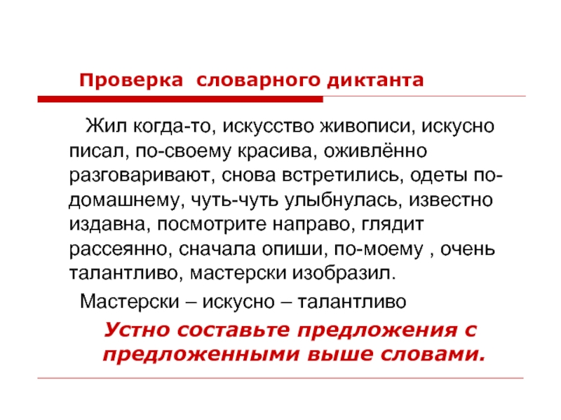 Жил когда(то), иску(с, сс)тво живописи, иску(с,сс)но писал, (по)своему красива, оживлё(н,нн)о разговаривают, снов(о,а) встретились, одеты (по)домашнему, (чуть)чуть улыбнулась, известно издавн(о,а), посмотрите направ(о,а), глядит рассея(н,нн)о, сначал(о,а)опиши, (по)моему , очень талантливо, мастерски изобр(о,а)зил.