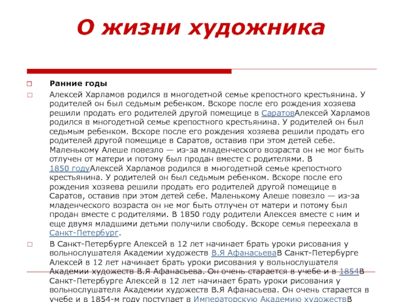 У родителей он был седьмым ребенком. Вскоре после его рождения хозяева решили продать его родителей другой помещице в СаратовАлексей Харламов родился в многодетной семье крепостного крестьянина. У родителей он был седьмым ребенком. Вскоре после его рождения хозяева решили продать его родителей другой помещице в Саратов, оставив при этом детей себе. Маленькому Алеше повезло — из-за младенческого возраста он не мог быть отлучен от матери и потому был продан вместе с родителями. В 1850 годуАлексей Харламов родился в многодетной семье крепостного крестьянина. У родителей он был седьмым ребенком. Вскоре после его рождения хозяева решили продать его родителей другой помещице в Саратов, оставив при этом детей себе. Маленькому Алеше повезло — из-за младенческого возраста он не мог быть отлучен от матери и потому был продан вместе с родителями. В 1850 году родители Алексея вместе с ним и еще двумя младшими детьми получили свободу. Вскоре семья переехала в Санкт-Петербург.