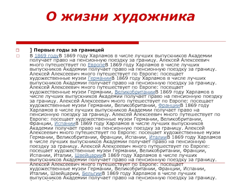числе лучших выпускников Академии получает право на пенсионную поездку за границу. Алексей Алексеевич много путешествует по ЕвропеВ 1869 году Харламов в числе лучших выпускников Академии получает право на пенсионную поездку за границу. Алексей Алексеевич много путешествует по Европе: посещает художественные музеи ГерманииВ 1869 году Харламов в числе лучших выпускников Академии получает право на пенсионную поездку за границу. Алексей Алексеевич много путешествует по Европе: посещает художественные музеи Германии, ВеликобританииВ 1869 году Харламов в числе лучших выпускников Академии получает право на пенсионную поездку за границу. Алексей Алексеевич много путешествует по Европе: посещает художественные музеи Германии, Великобритании, ФранцииВ 1869 году Харламов в числе лучших выпускников Академии получает право на пенсионную поездку за границу. Алексей Алексеевич много путешествует по Европе: посещает художественные музеи Германии, Великобритании, Франции, ИспанииВ 1869 году Харламов в числе лучших выпускников Академии получает право на пенсионную поездку за границу. Алексей Алексеевич много путешествует по Европе: посещает художественные музеи Германии, Великобритании, Франции, Испании, ИталииВ 1869 году Харламов в числе лучших выпускников Академии получает право на пенсионную поездку за границу. Алексей Алексеевич много путешествует по Европе: посещает художественные музеи Германии, Великобритании, Франции, Испании, Италии, ШвейцарииВ 1869 году Харламов в числе лучших выпускников Академии получает право на пенсионную поездку за границу. Алексей Алексеевич много путешествует по Европе: посещает художественные музеи Германии, Великобритании, Франции, Испании, Италии, Швейцарии, БельгииВ 1869 году Харламов в числе лучших выпускников Академии получает право на пенсионную поездку за границу. Алексей Алексеевич много путешествует по Европе: посещает художественные музеи Германии, Великобритании, Франции, Испании, Италии, Швейцарии, Бельгии, ГолландииВ 1869 году Харламов в числе лучших выпускников Академии получает право на пенсионную поездку за границу. Алексей Алексеевич много путешествует по Европе: посещает художественные музеи Германии, Великобритании, Франции, Испании, Италии, Швейцарии, Бельгии, Голландии. Некоторое время живет в ПарижеВ 1869 году Харламов в числе лучших выпускников Академии получает право на пенсионную поездку за границу. Алексей Алексеевич много путешествует по Европе: посещает художественные музеи Германии, Великобритании, Франции, Испании, Италии, Швейцарии, Бельгии, Голландии. Некоторое время живет в Париже. В 1871В 1869 году Харламов в числе лучших выпускников Академии получает право на пенсионную поездку за границу. Алексей Алексеевич много путешествует по Европе: посещает художественные музеи Германии, Великобритании, Франции, Испании, Италии, Швейцарии, Бельгии, Голландии. Некоторое время живет в Париже. В 1871—1872 годахВ 1869 году Харламов в числе лучших выпускников Академии получает право на пенсионную поездку за границу. Алексей Алексеевич много путешествует по Европе: посещает художественные музеи Германии, Великобритании, Франции, Испании, Италии, Швейцарии, Бельгии, Голландии. Некоторое время живет в Париже. В 1871—1872 годах по заказу музея Петербургской Академии художеств он делает во дв