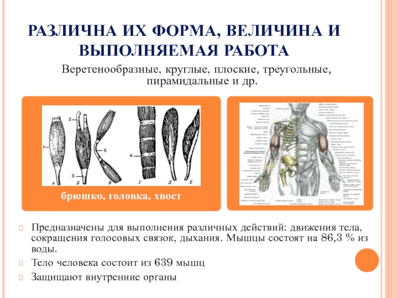 Веретенообразные, круглые, плоские, треугольные, пирамидальные и др.
