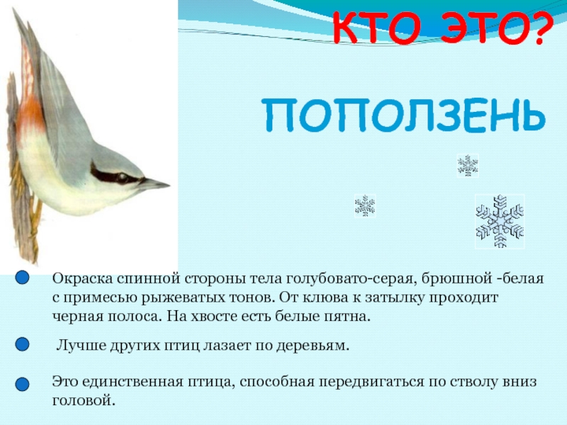 Это единственная птица, способная передвигаться по стволу вниз головой.