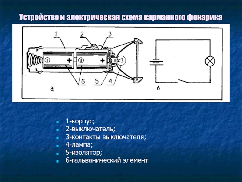 Слайд 9Устройство и электрическая схема карманного фонарика