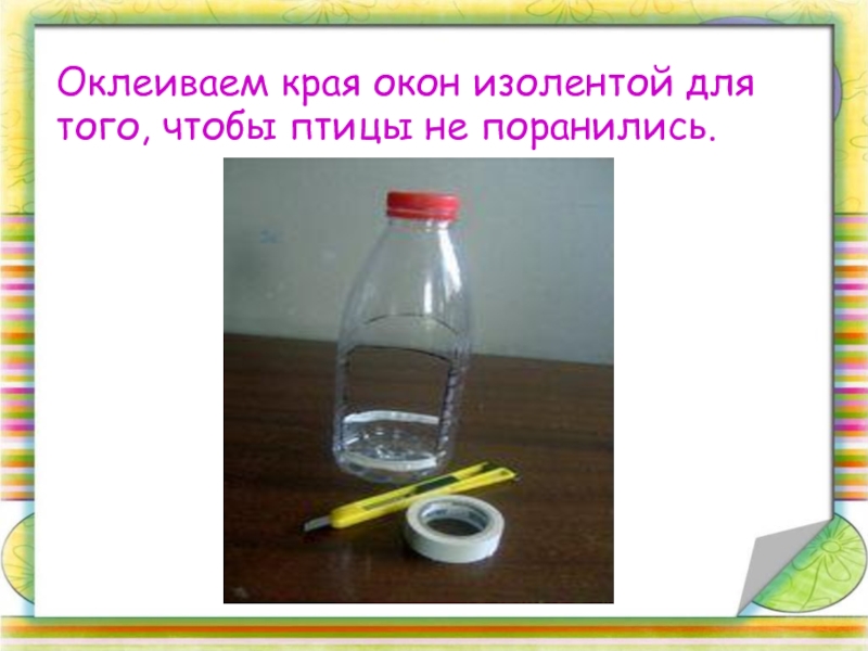 Слайд 9Оклеиваем края окон изолентой для того, чтобы птицы не поранились.