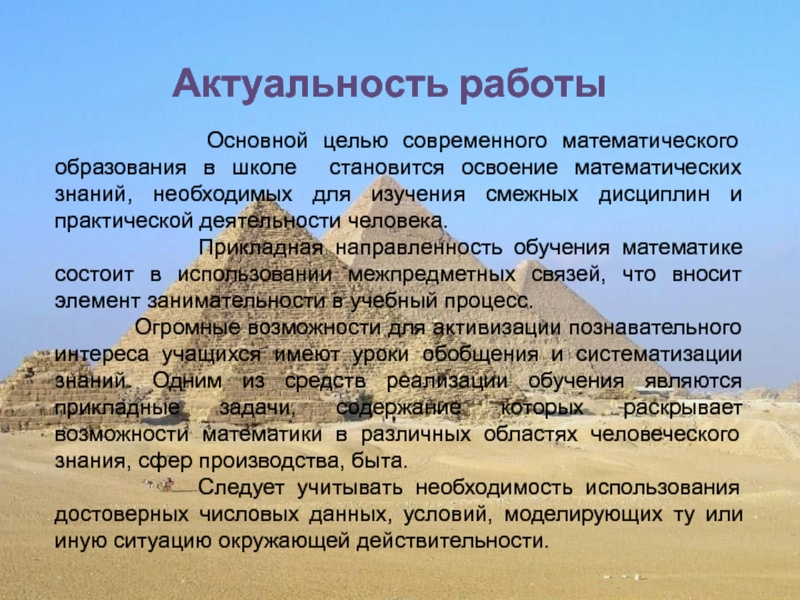 Огромные возможности для активизации познавательного интереса учащихся имеют уроки обобщения и систематизации знаний. Одним из средств реализации обучения являются прикладные задачи, содержание которых раскрывает возможности математики в различных областях человеческого знания, сфер производства, быта.