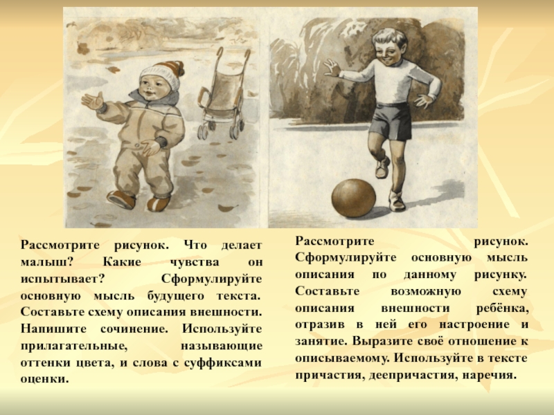 Рассмотрите рисунок. Сформулируйте основную мысль описания по данному рисунку. Составьте возможную схему описания внешности ребёнка, отразив в ней его настроение и занятие. Выразите своё отношение к описываемому. Используйте в тексте причастия, деепричастия, наречия.