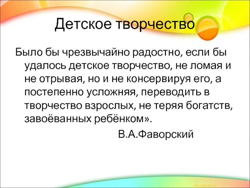 ломая и не отрывая, но и не консервируя его, а постепенно усложняя, переводить в творчество взрослых, не теряя богатств, завоёванных ребёнком».