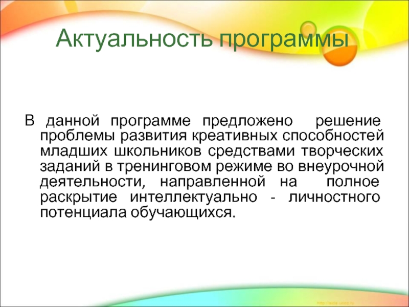 младших школьников средствами творческих заданий в тренинговом режиме во внеурочной деятельности, направленной на полное раскрытие интеллектуально - личностного потенциала обучающихся.