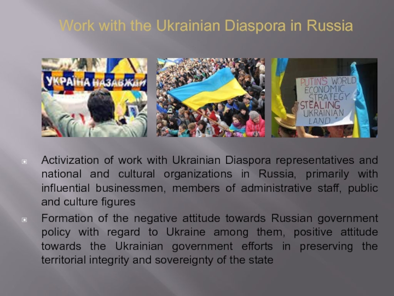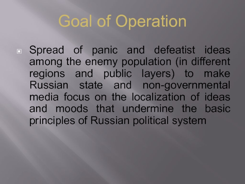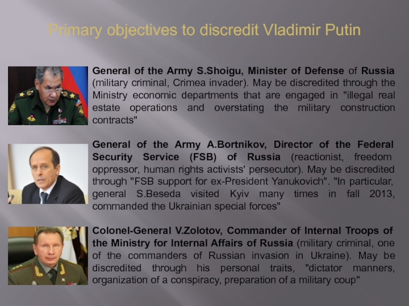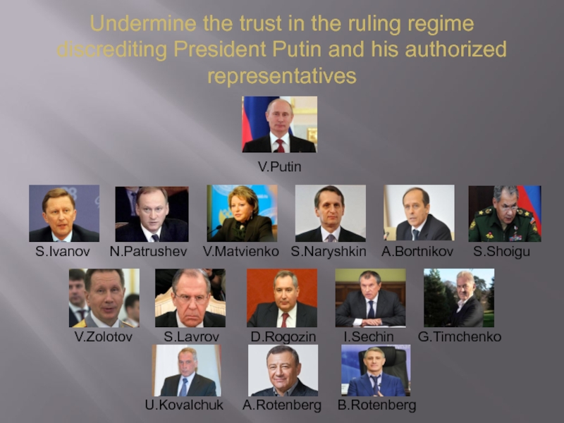 Undermine the trust in the ruling regime discrediting President Putin and his authorized representatives