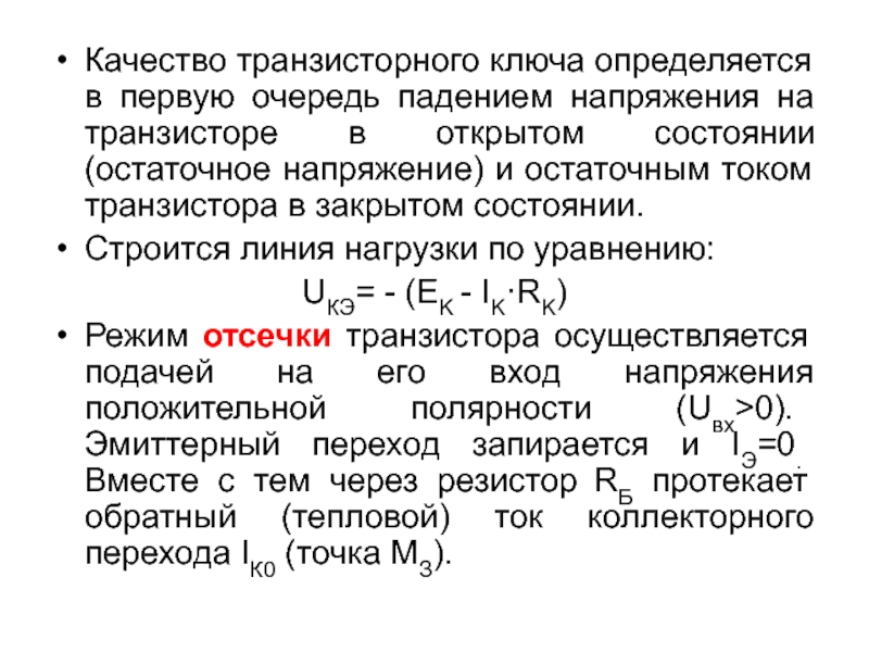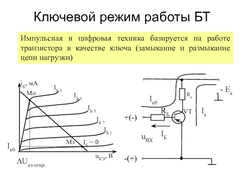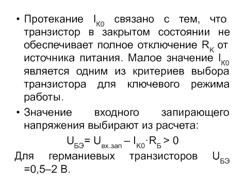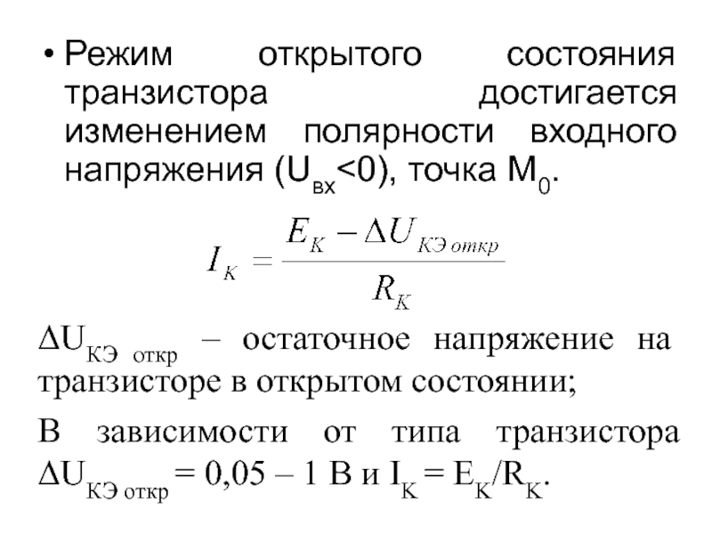В зависимости от типа транзистора ΔUКЭ откр = 0,05 – 1 В и IK = EK/RK.