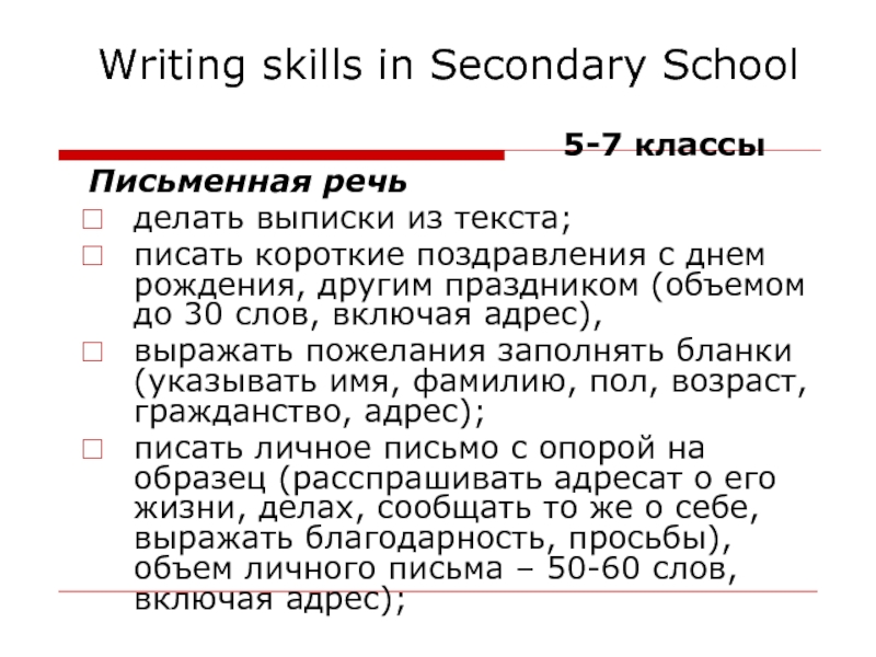 Слайд 7Writing skills in Secondary School