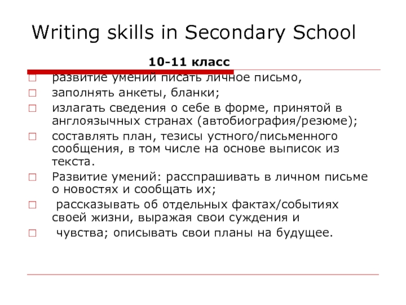 Слайд 10Writing skills in Secondary School