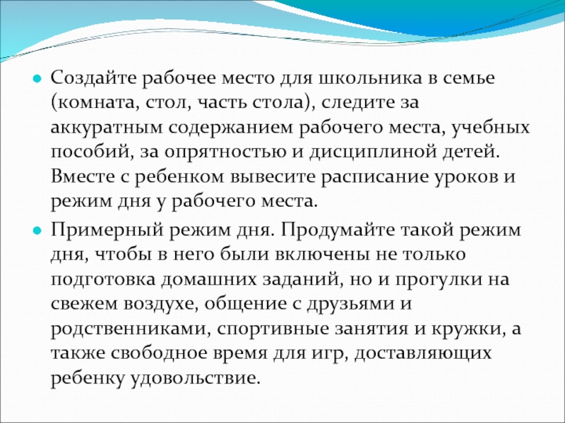 следите за аккуратным содержанием рабочего места, учебных пособий, за опрятностью и дисциплиной детей. Вместе с ребенком вывесите расписание уроков и режим дня у рабочего места.