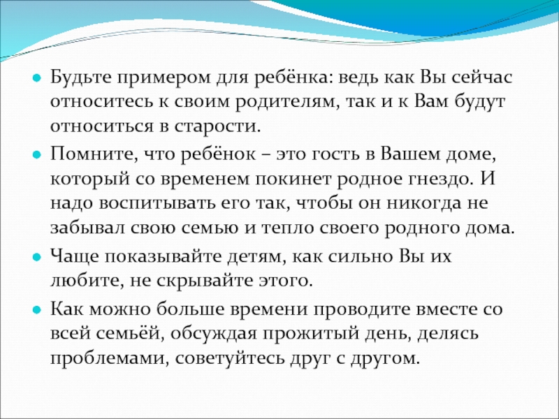 Помните, что ребёнок – это гость в Вашем доме, который со временем покинет родное гнездо. И надо воспитывать его так, чтобы он никогда не забывал свою семью и тепло своего родного дома.