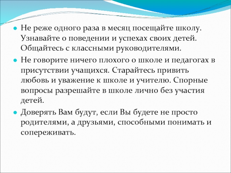 Слайд 13Не реже одного раза в месяц посещайте школу. Узнавайте о поведении