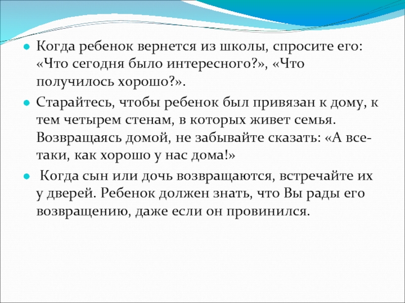 Слайд 10Когда ребенок вернется из школы, спросите его: «Что сегодня было интересного?»,