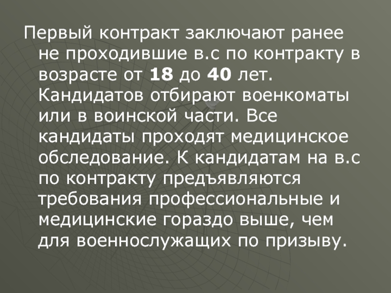 Слайд 8Первый контракт заключают ранее не проходившие в.с по контракту в возрасте