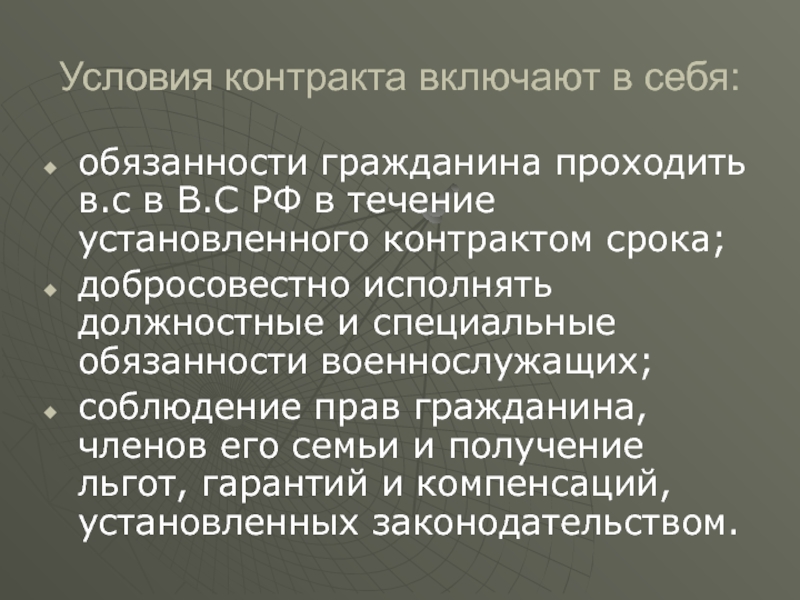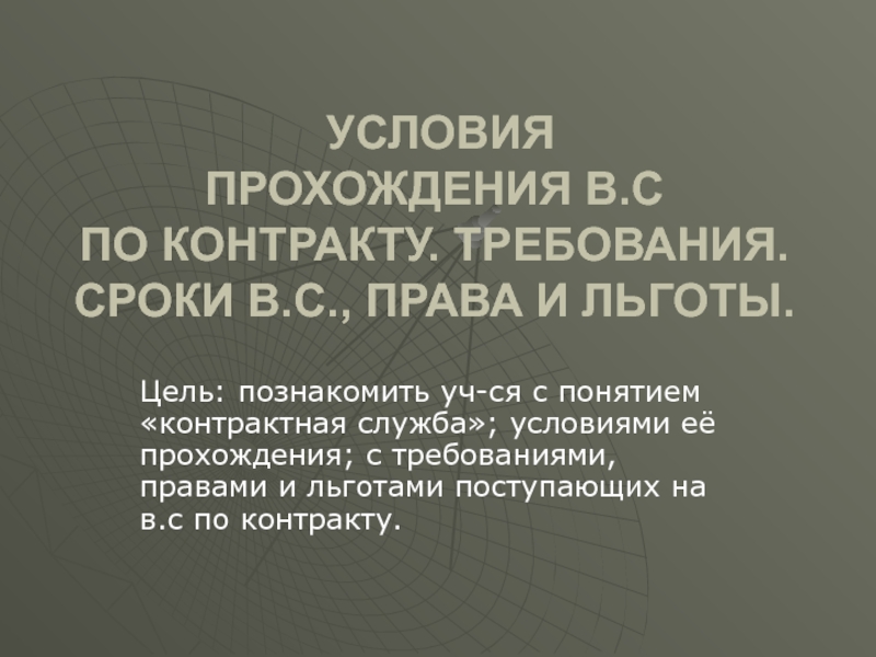 уч-ся с понятием «контрактная служба»; условиями её прохождения; с требованиями, правами и льготами поступающих на в.с по контракту.
