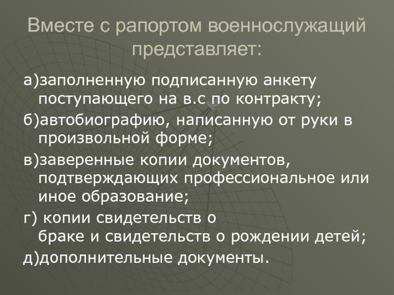 Слайд 7Вместе с рапортом военнослужащий представляет: