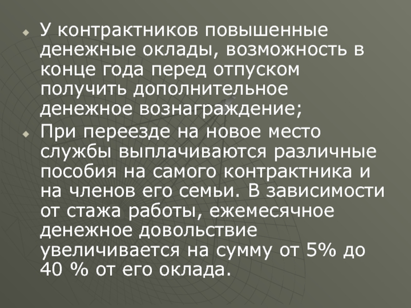 Слайд 11У контрактников повышенные денежные оклады, возможность в конце года перед отпуском