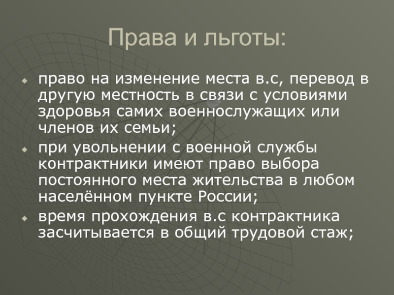 при увольнении с военной службы контрактники имеют право выбора постоянного места жительства в любом населённом пункте России;