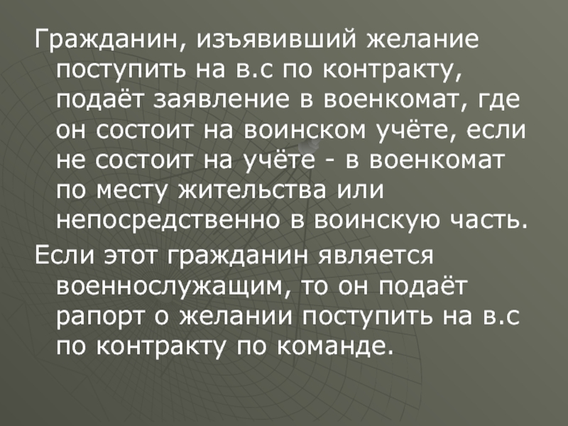 Слайд 6Гражданин, изъявивший желание поступить на в.с по контракту, подаёт заявление в