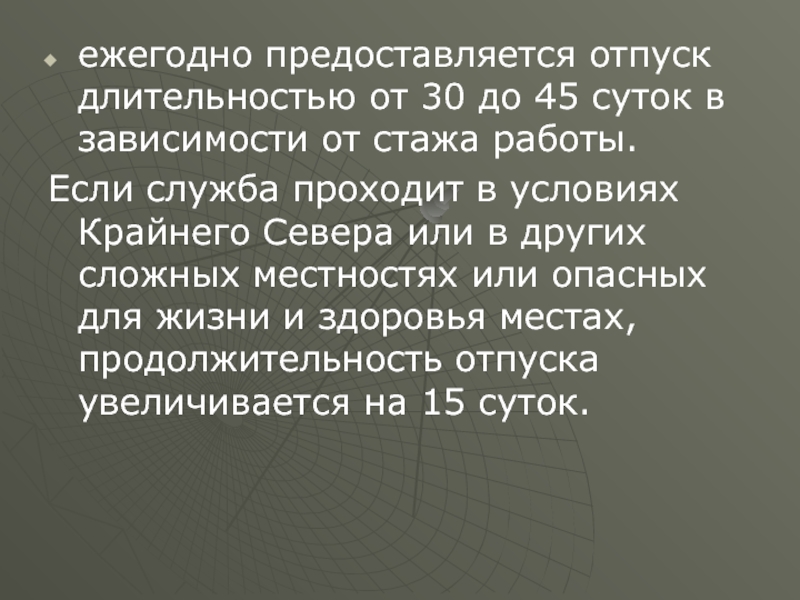 Слайд 10ежегодно предоставляется отпуск длительностью от 30 до 45 суток в зависимости