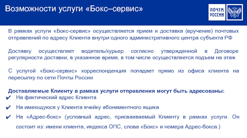 Доставляемые Клиенту в рамках услуги отправления могут быть адресованы отправителями как на Адрес-бокс, так и на фактический адрес Клиента, либо на имеющуюся у клиента ячейку абонементного ящика.