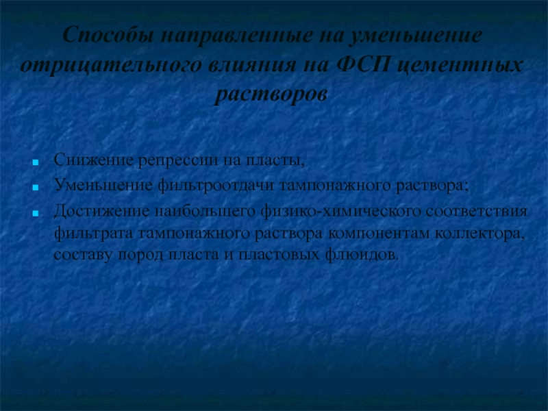 Слайд 11Способы направленные на уменьшение отрицательного влияния на ФСП цементных растворов