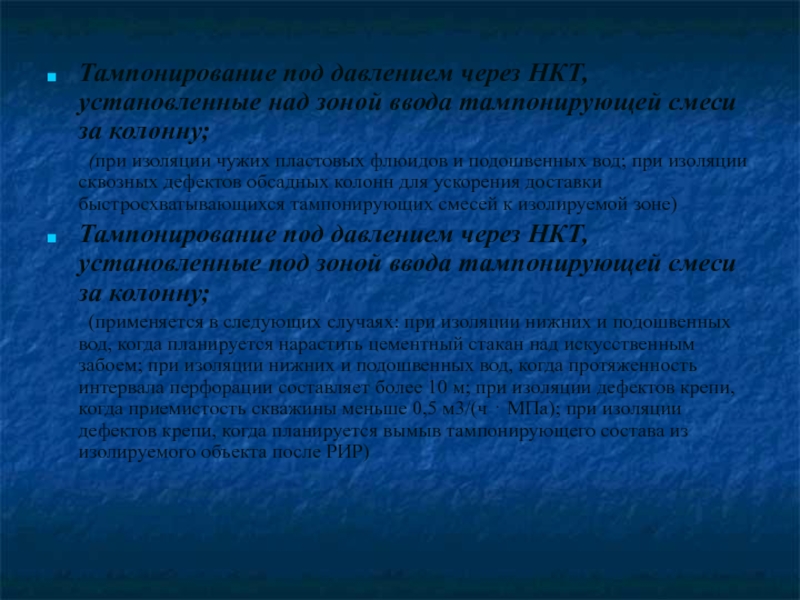 (применяется в следующих случаях: при изоляции нижних и подошвенных вод, когда планируется нарастить цементный стакан над искусственным забоем; при изоляции нижних и подошвенных вод, когда протяженность интервала перфорации составляет более 10 м; при изоляции дефектов крепи, когда приемистость скважины меньше 0,5 м3/(ч ⋅ МПа); при изоляции дефектов крепи, когда планируется вымыв тампонирующего состава из изолируемого объекта после РИР)