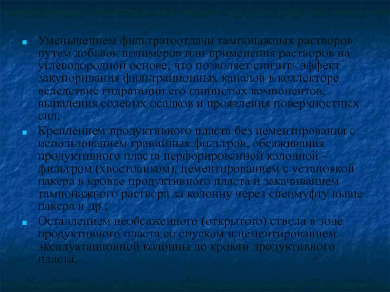 Слайд 13Уменьшением фильтратоотдачи тампонажных растворов путем добавок полимеров или применения растворов на