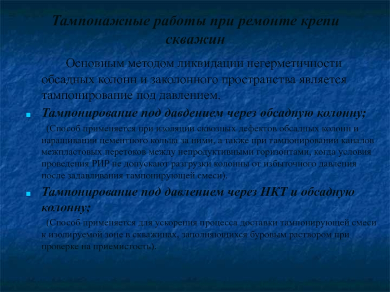 Тампонирование под давлением через НКТ и обсадную колонну;