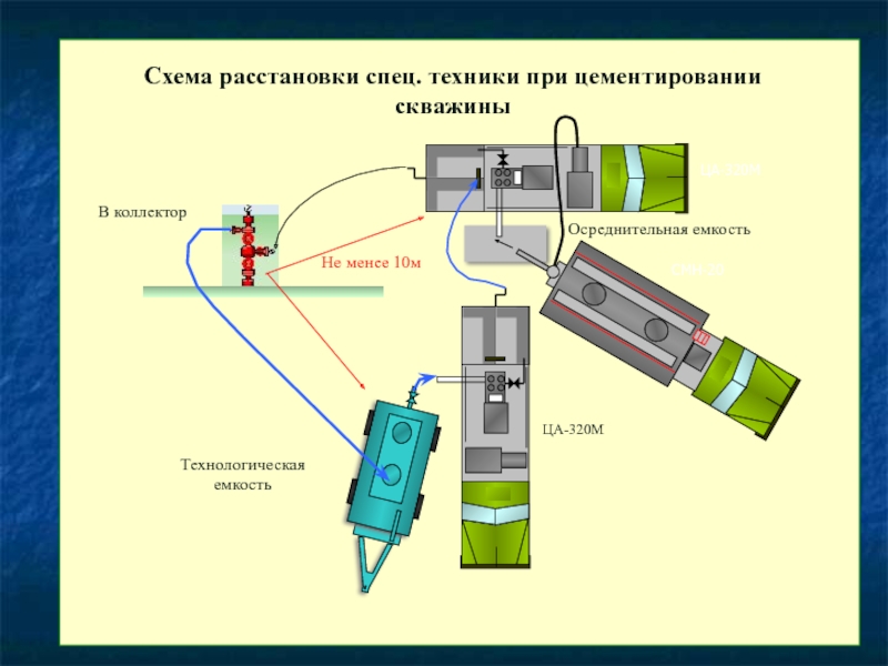 Передвижные насосные установки необходимо располагать согласно утвержденной схемы на расстоянии не менее 10 м от устья скважины, расстояние между ними должно быть не менее 1м. Другие установки для выполнения работ должны размещаться на расстоянии не менее 25 м от устья скважины. Агрегаты устанавливаются кабинами от устья скважины.