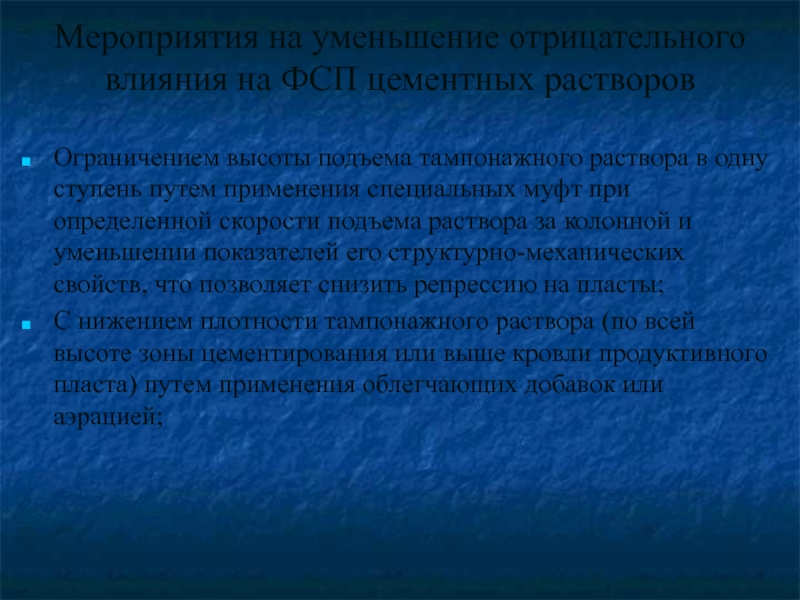 Слайд 12Мероприятия на уменьшение отрицательного влияния на ФСП цементных растворов