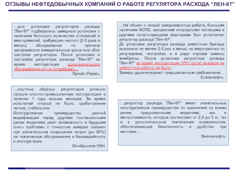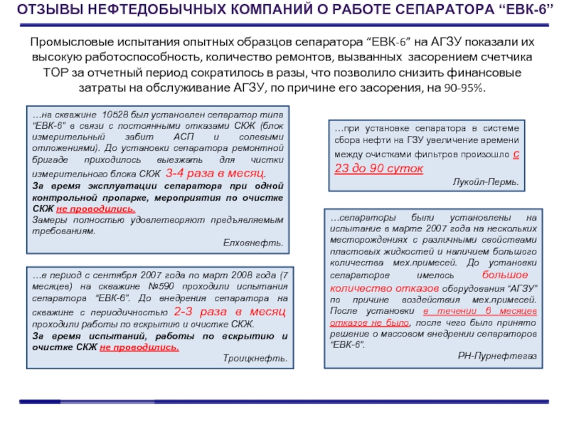 ОТЗЫВЫ НЕФТЕДОБЫЧНЫХ КОМПАНИЙ О РАБОТЕ СЕПАРАТОРА “ЕВК-6”