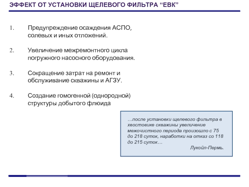 ЭФФЕКТ ОТ УСТАНОВКИ ЩЕЛЕВОГО ФИЛЬТРА “ЕВК”