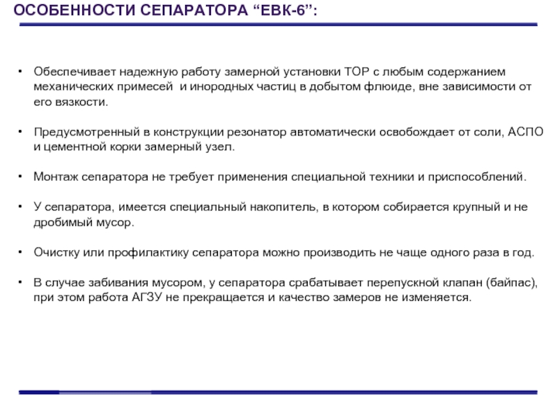 ОСОБЕННОСТИ СЕПАРАТОРА “ЕВК-6”: