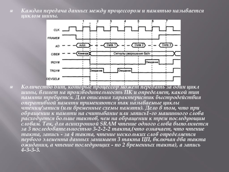бит, которые процессор может передать за один цикл шины, влияет на производительность ПК и определяет, какой тип памяти требуется. Для описания характеристик быстродействия оперативной памяти применяются так называемые циклы чтения/записи (или временные схемы памяти). Дело в том, что при обращении к памяти на считывание или запись1-го машинного слова расходуется больше тактов, чем на обращении к трем последующим словам. Так, для асинхронной SRAM чтение одного слова выполняется за 3 последовательностью 3-2-2-2 такта,(что означает, что чтение такта, запись - за 4 такта, чтение нескольких слов определяется первого элемента данных занимает 3 такта ЦП, включая два такта ожидания, а чтение последующих - по 2 временных такта), а запись 4-3-3-3.