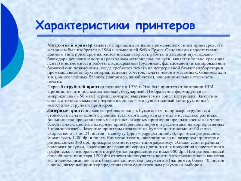 Лазерные принтеры менее требовательны к бумаге, чем, например, струйные, а стоимость печати одной страницы текстового документа у них в несколько раз ниже. Большинство представленных на рынке лазерных принтеров предназначены для черно-белой печати; цветные лазерные принтеры пока дороги и рассчитаны на корпоративных 3 пользователей. Лазерные принтеры печатают на бумаге плотностью от 60 г/мсо скоростью от 8 до 24 листов в минуту (ppm – page per minutes), при этом разрешение может быть 1200 dpi и более. Качество текста, напечатанного на лазерном принтере с разрешением 300 dpi, примерно соответствует типографскому. Однако если страница содержит рисунки, содержащие градации серого цвета, то для получения качественного графического изображения потребуется разрешение не ниже 600 dpi. При разрешающей способности принтера 1200 dpi отпечаток получается почти фотографического качества. Если необходимо печатать большое количество документов (например, более 40 листов в день), лазерный принтер представляется единственным разумным выбором.