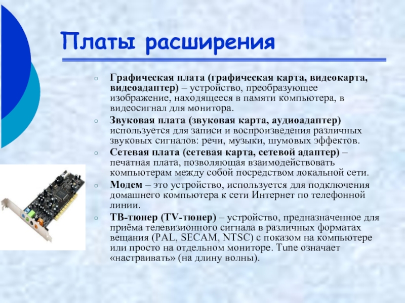 Звуковая плата (звуковая карта, аудиоадаптер) используется для записи и воспроизведения различных звуковых сигналов: речи, музыки, шумовых эффектов.