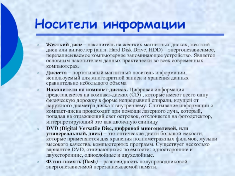 Оперативная память – энергозависимая, т.е. данные в ней хранятся только до выключения ПК. Для долговременного хранения информации служат дискеты, винчестеры, компакт-диски и т.д.