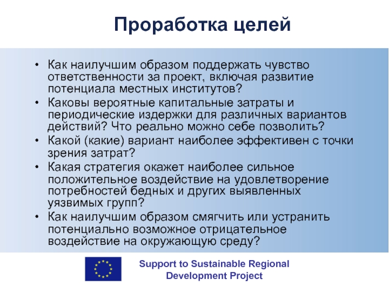 с особым учётом таких факторов, как чувство ответственности бенефициаров, политическая поддержка, экономические и финансовые факторы, социально-культурные аспекты, равенство полов, соответствующие технологии, экологические аспекты, а также институционный и управленческий потенциал.