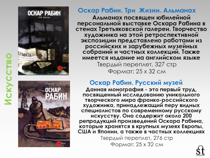 Данная монография - это первый труд, посвященный исследованию уникального творческого мира франко-российского художника, принадлежащий перу видных специалистов по современному русскому искусству. Она содержит около 200 репродукций произведений Оскара Рабина, которые хранятся в крупных музеях Европы, США и Японии, а также в частных коллекциях
