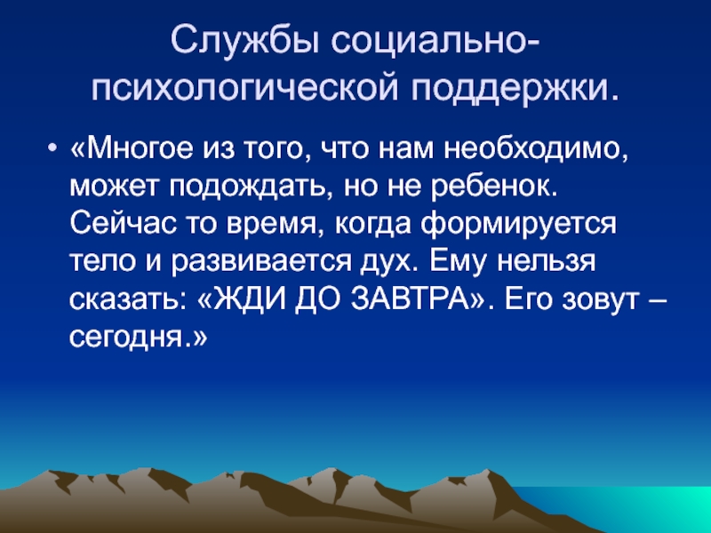но не ребенок. Сейчас то время, когда формируется тело и развивается дух. Ему нельзя сказать: «ЖДИ ДО ЗАВТРА». Его зовут – сегодня.»