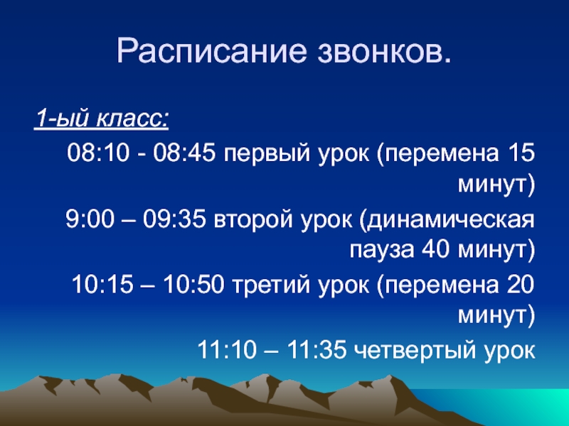08:10 – 08:50 первый урок (перемена 10 минут)