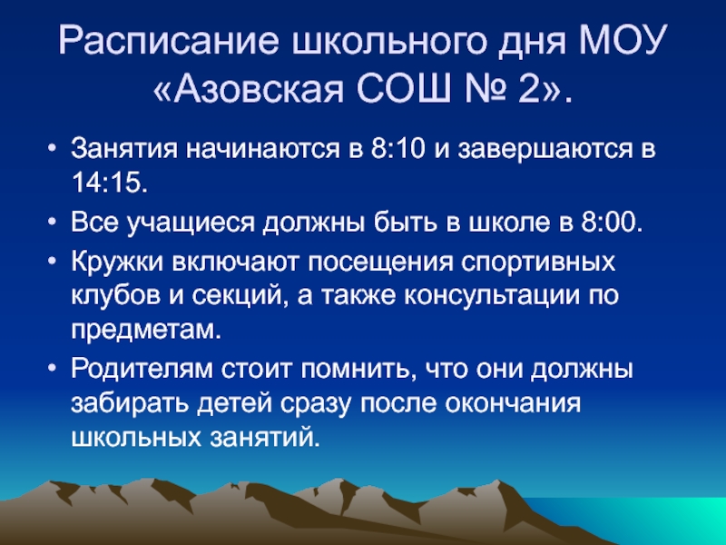 Слайд 8Расписание школьного дня МОУ «Азовская СОШ № 2».