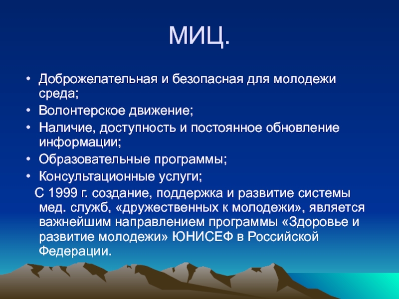С 1999 г. создание, поддержка и развитие системы мед. служб, «дружественных к молодежи», является важнейшим направлением программы «Здоровье и развитие молодежи» ЮНИСЕФ в Российской Федерации.